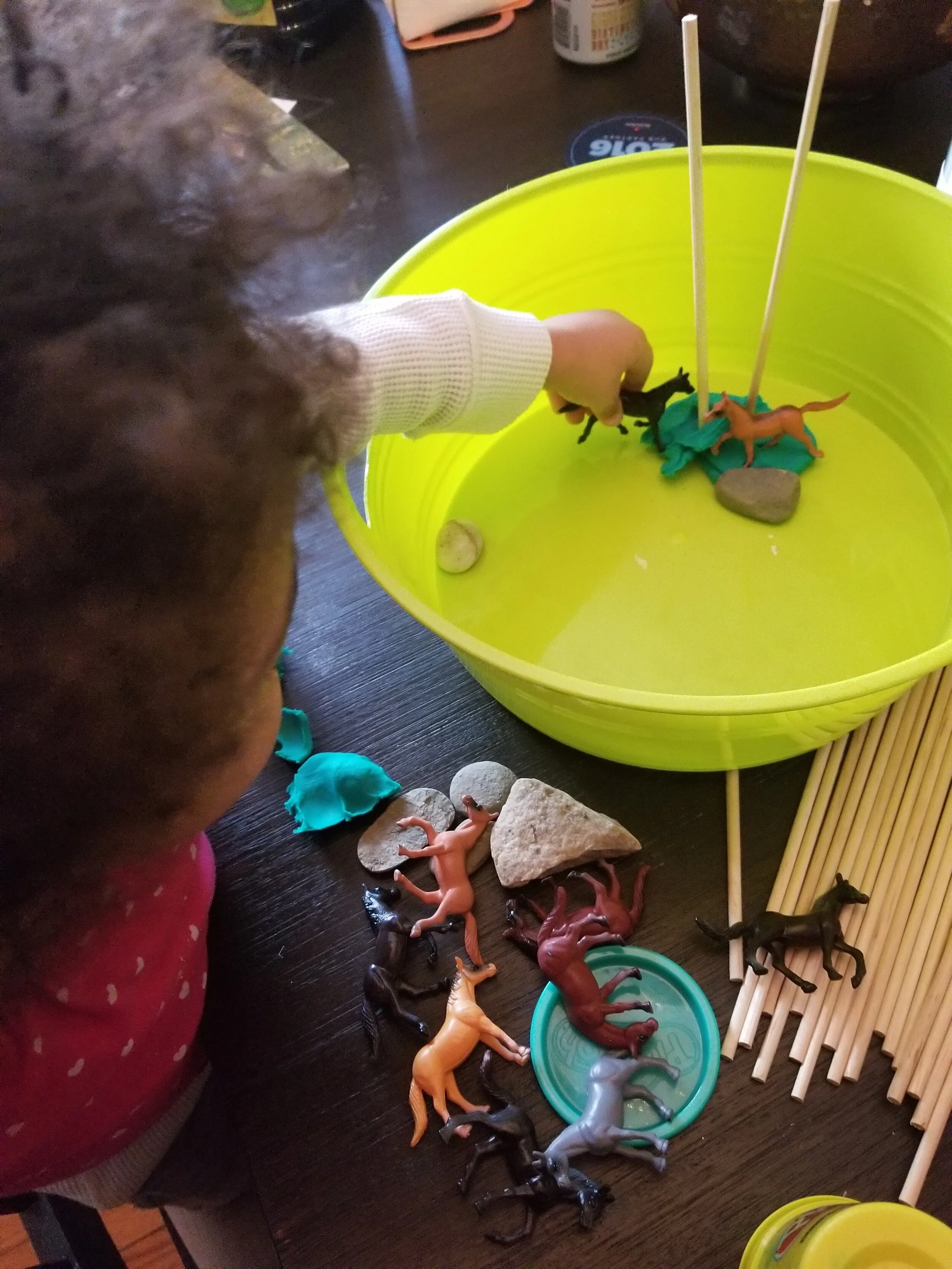 My toddler has been suddenly very into horses lately and I recently decided to make one of these trays. I was in the dollar store and found craft sticks, a small bin/tray, play dough, and a small package of horses. We had also been to a library book sale that week and she had picked out a book about horses for 10 cents. I chose some rocks from her collection on our porch and viola! Play dough horse tray! Total cost: $4.10